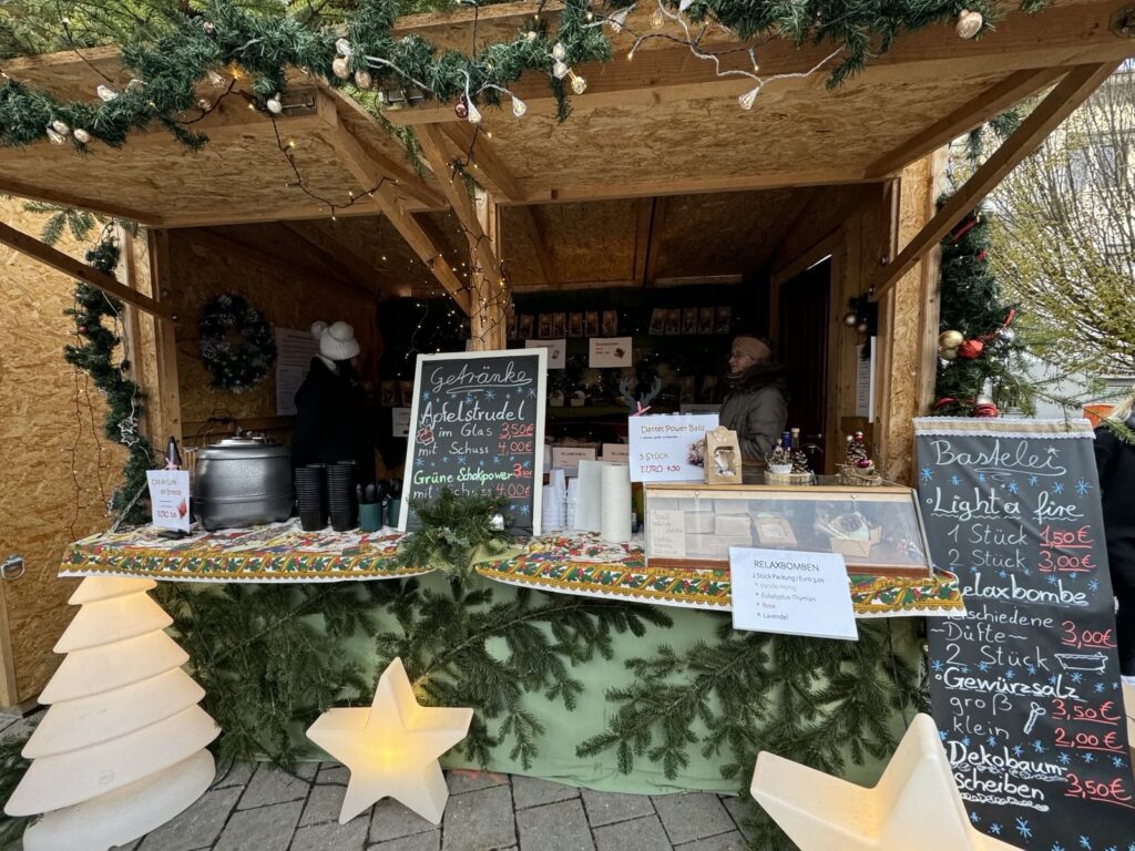 Besucher:innen erwarten kulinarische Spezialitäten mit ökologischem Anspruch: Von herzhaftem Chili sin carne – einer klimafreundlichen Alternative zu klassischen Fleischgerichten – über den flüssigen Apfelstrudel, eine regionale Köstlichkeit, bis hin zur „Green Power Schoki“, die mit fair gehandelten Zutaten überzeugt. Ergänzt wird das Angebot durch Olivenöl und Kräuter aus Kreta, die direkt von lokalen Produzent:innen bezogen werden. Für Naschkatzen hält der Stand zudem hausgemachte Süßigkeiten bereit, während kleine Weihnachtsbasteleien zum Mitnehmen einladen.